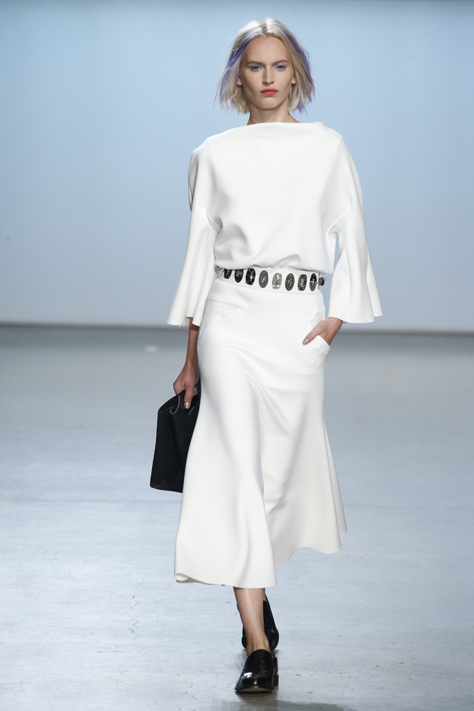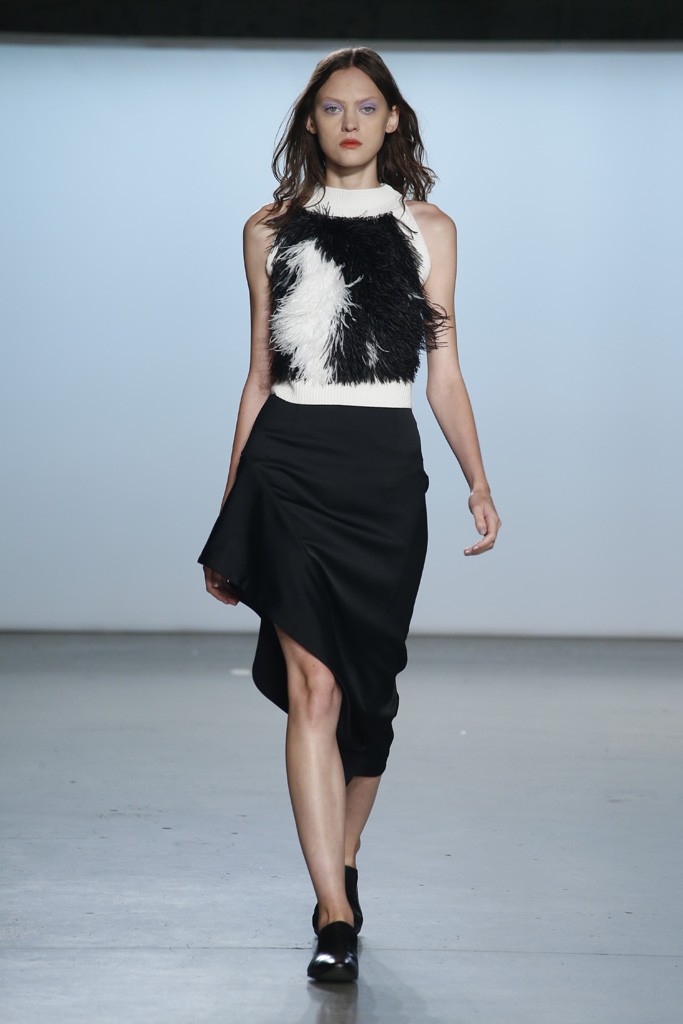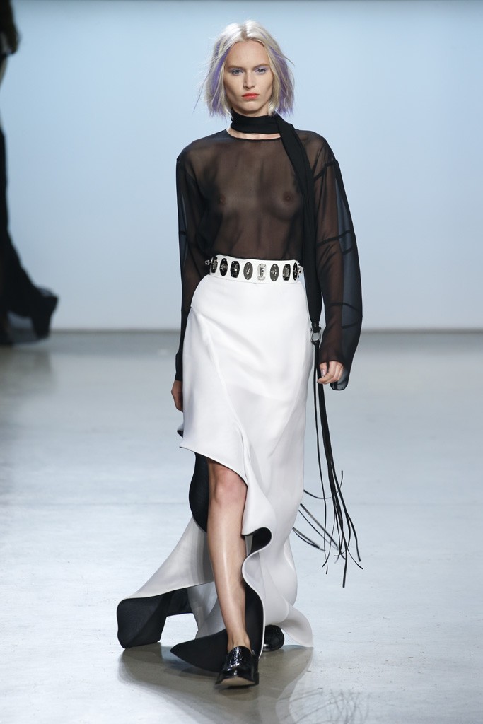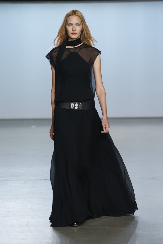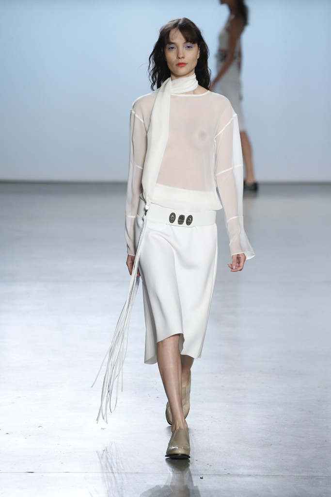 Straying from the seasonal stereotypical, designer Ms. Sally LaPointe went to trod her own path to make Spring|Summer 2015 sans a plethora of hues or florals. Instead, she went for more chic: a color palette of black and white. Taking inspiration of a conservative and classic goddess, Ms. LaPointe designed a majority of the collection with no exposure of the neckline, however, then turned liberal and modern at the sheer shirts and dresses.